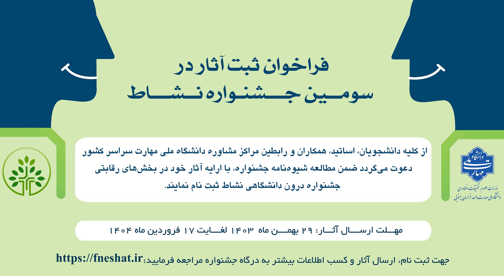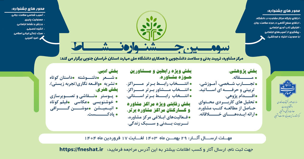 دعوت از دانشجویان، همکاران، اساتید و رابطین مراکز مشاوره دانشگاه ملی مهارت جهت ثبت نام در سومین جشنواره درون دانشگاهی نشاط.